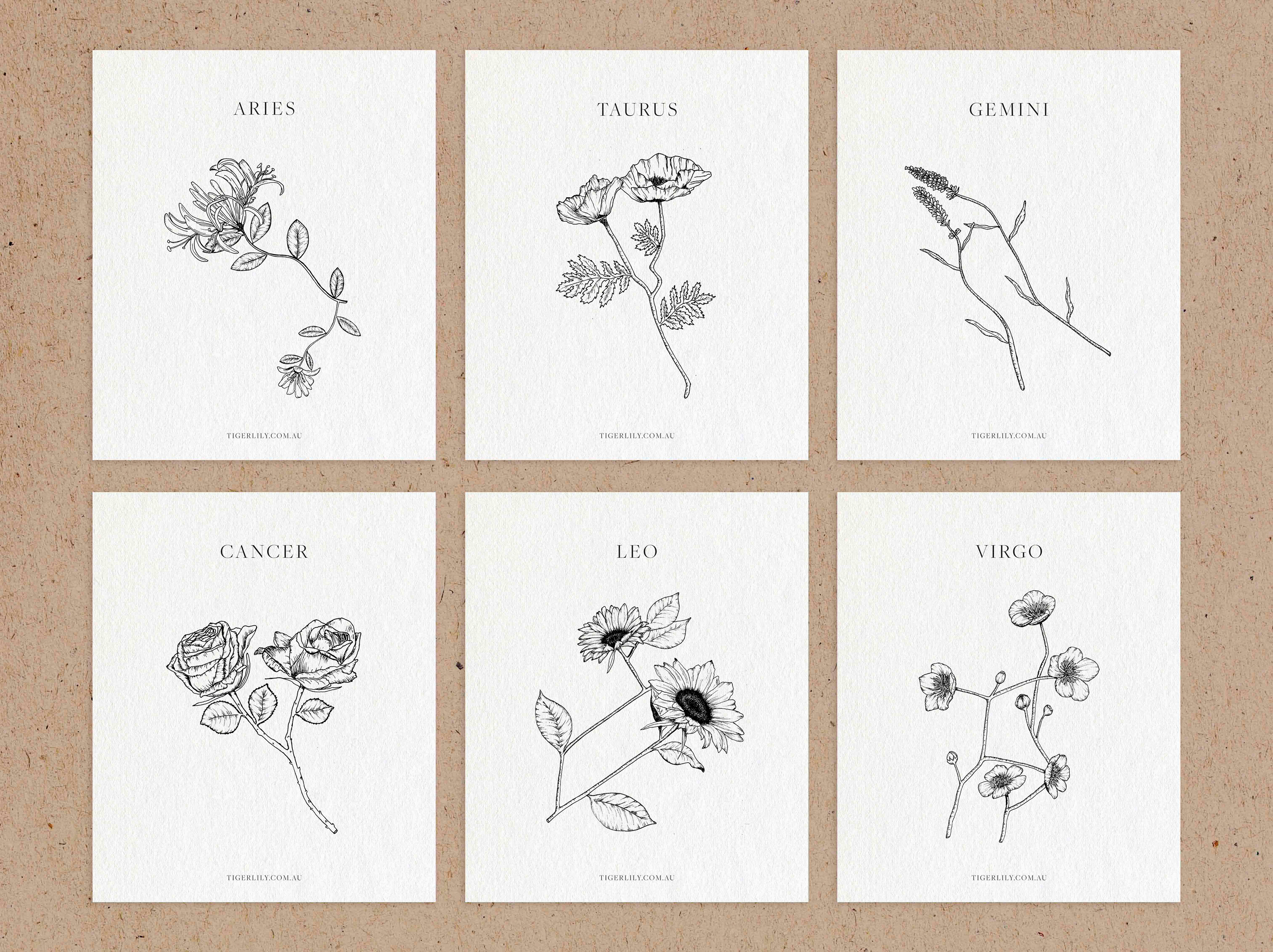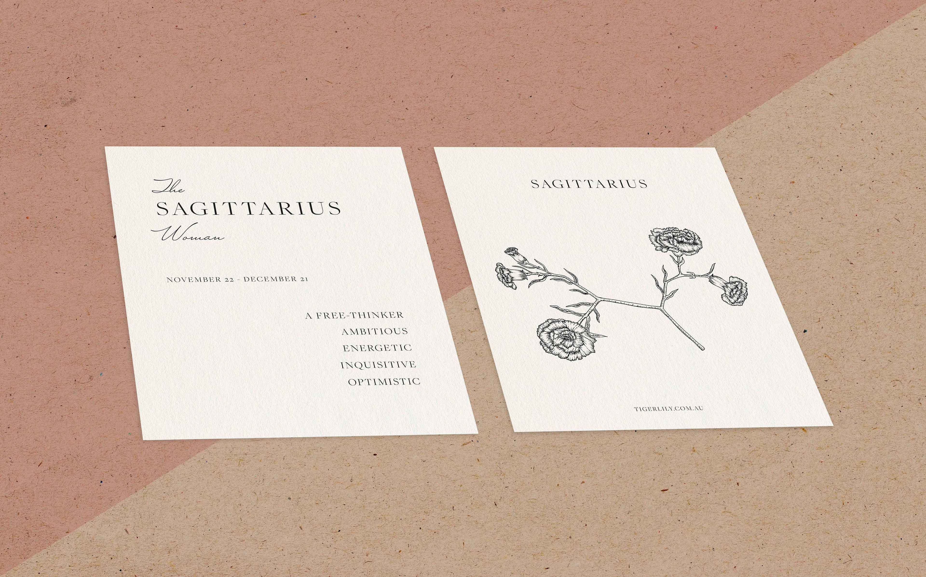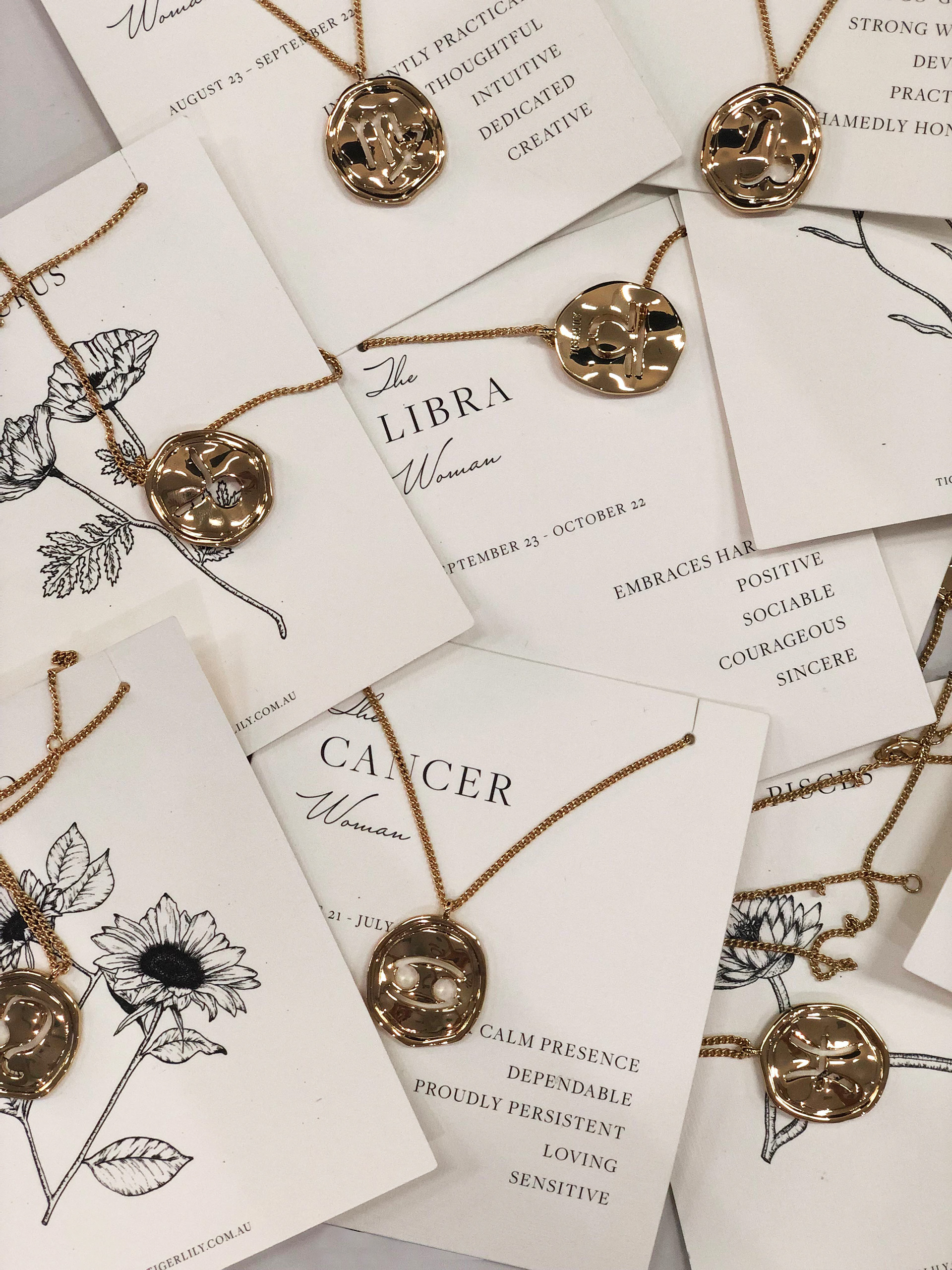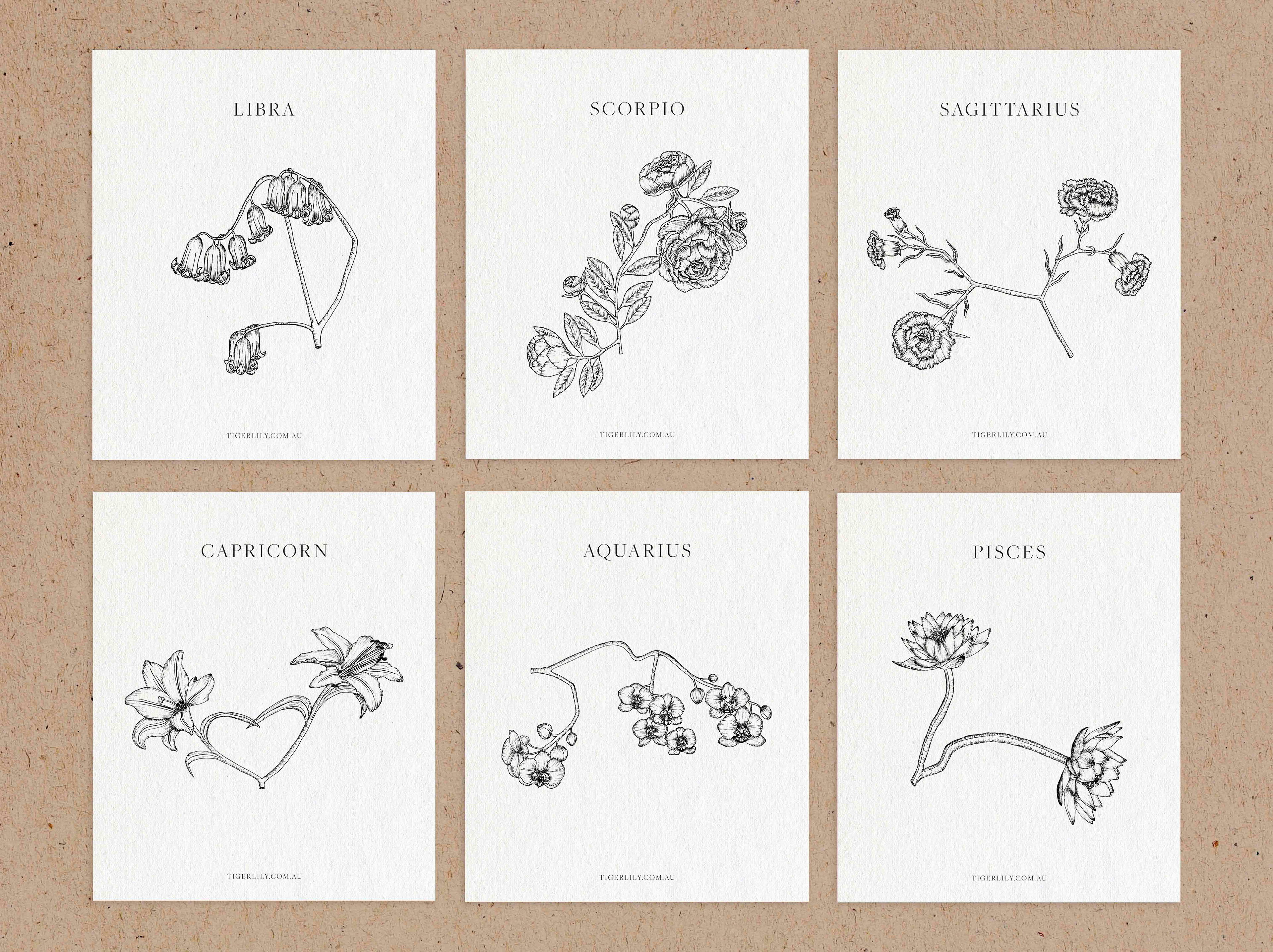 Packaging jewellery cards designed for fashion brand Tigerlily. There are 12 cards in total for each zodiac sign, each card has an illustration of the zodiac flower in the shape of its constellation.
